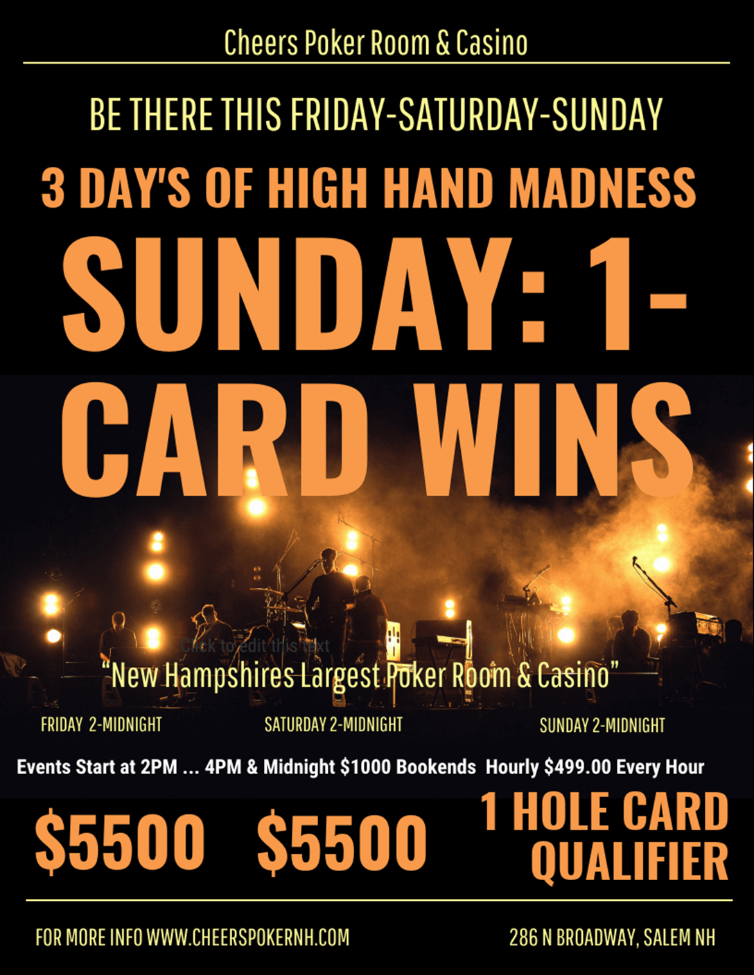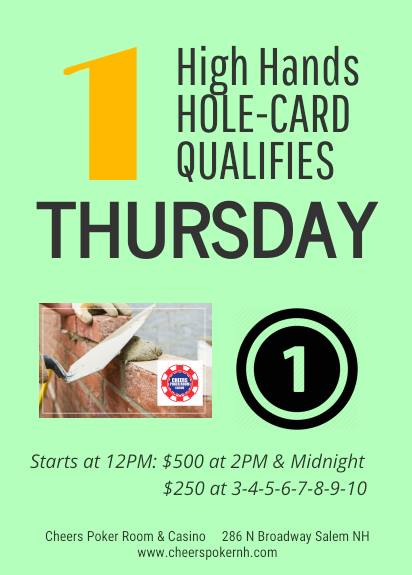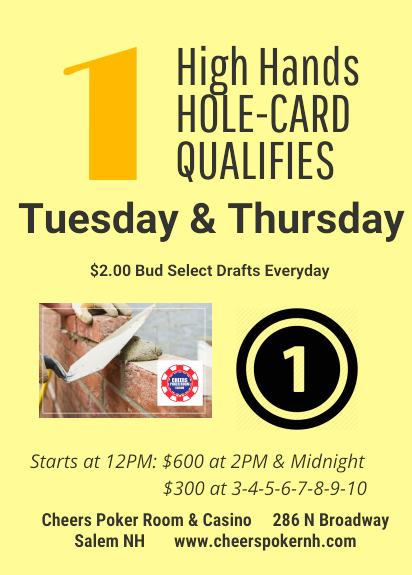Cheers Poker Room 286 North Broadway, Salem, NH, United StatesHi-Hands start at 12 PM and end at 12 AM. Hi-Hands at 2 PM and 12 AM will be $500 while Hi-Hands at 3, 4, 5, 6, 7, 8, 9 and 10 will be $250.