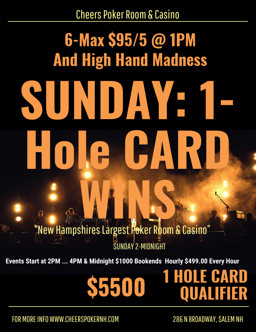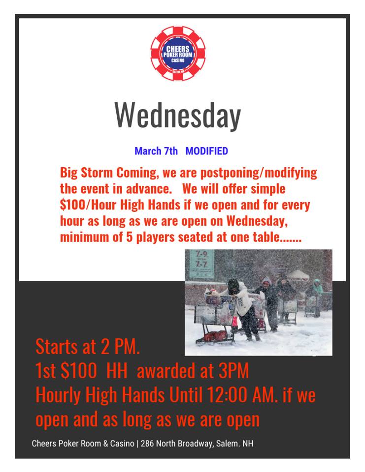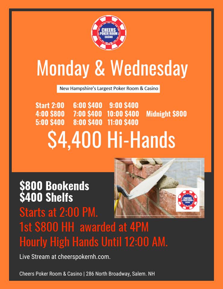 Cheers Poker Room 286 North Broadway, Salem, NH, United StatesHourly Hi-Hands start at 4 PM and end at 12 AM. The first and last Hi-Hands will be $800 while all other Hi-Hands will be $400.